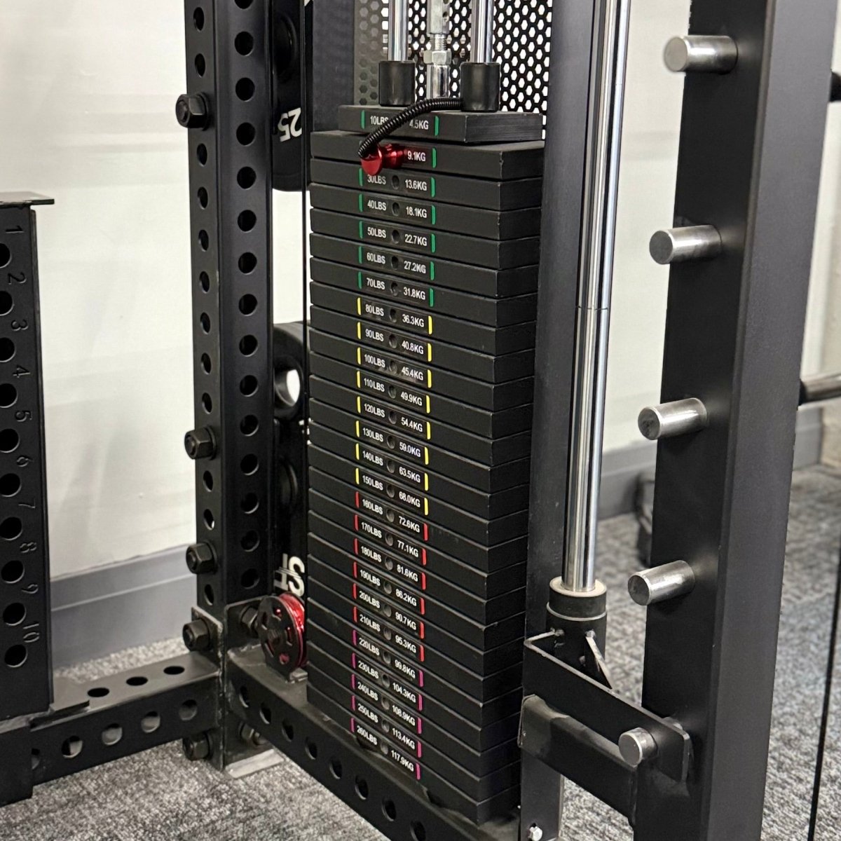 • Comprehensive Attachments: Comes equipped with J-hooks, spotter arms, lat pulldown seat, pull-up handles, 8 x weight storage pegs, back row foot plate, landmine, leg press plate, and a 5-piece cable attachment pack.